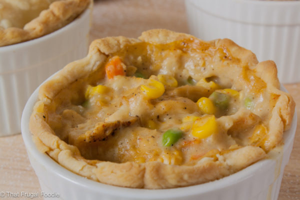 This is a great Chicken Pot Pie recipe to make in a big batch and freeze. I like to have a couple pot pies in the freezer for those days when I know I won’t want to cook when I get home. Each pie only costs about $6 and serves 4 people.