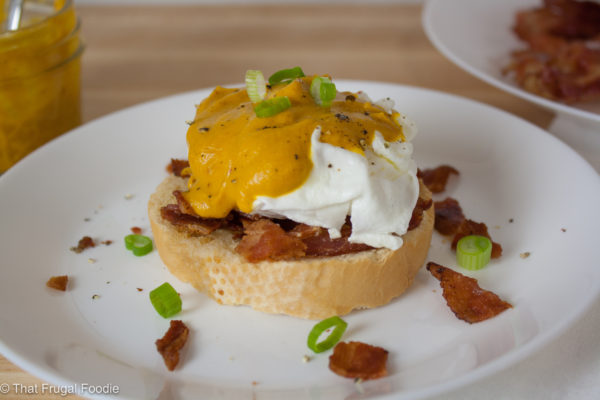 - Just before the sauce is done poach the eggs. Place the bread, then bacon, then poached egg in a stack on the plate. Spoon the carrot butter sauce over the top.